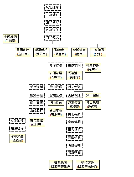※中國禪宗之派別,概始於四祖、五祖門下,故凡初祖達摩、二祖慧可、三祖僧璨、四祖道信、五祖弘忍…等禪師之基本資料,於「宗派」一欄皆標示為「禪宗」。請參考「禪宗宗派系譜圖」。